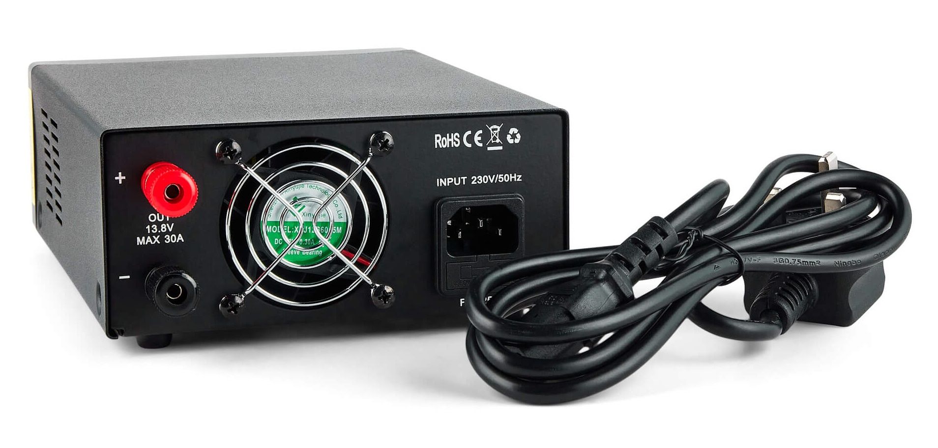 SHARMAN SM30SWIV PSU switching power supply provides 13.8 VDC at 20 Amps continuous, 30 Amps surge.
